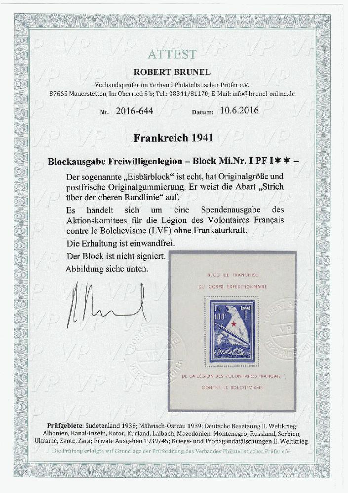 | Zusatzinformationen und Suchstichworte: | 145., 146. und 147. Teutoburger Münzauktion Auktionstermin: 28. Mai 2022 Los 4797 Deutsche Besetzung II. WK Französische Legion Eisbärblock 1941, postfrische Luxuserhaltung, unsigniert, Plattenfehler ,,I" (Strich im oberen Zähnungsrand). Fotoattest Brunel >Die Erhaltung ist einwandfrei<. Mi. 1.200,-€. Zuschlag 350,00 EUR |