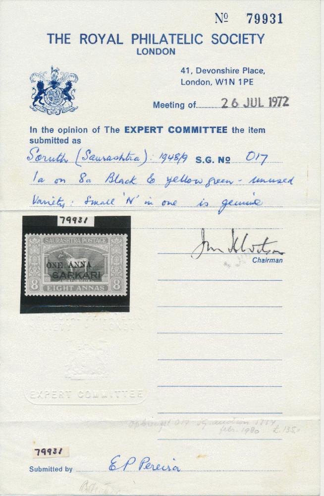| Zusatzinformationen und Suchstichworte: | Doreen Royan & Associates Shop - Online Los 751250 Indien Staaten Soruth India/Soruth 1948 King George VI Official 1a. on 8a. black and yellow-green. Variety, ‘Small “N” in “ONE”‘. Superb unmounted mint condition Festpreis 450,00 GBP |