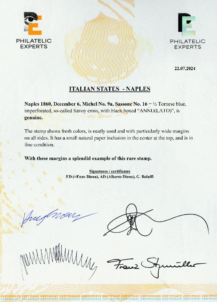 | Zusatzinformationen und Suchstichworte: | Heinrich Köhler 384. Auktion 19./20., 23. - 28. September 2024 Los 1289 Italien Staaten Neapel 1860, Croce di Savoia ½ t. Blau, farbfrisch, mit außerordentlich ringsum breitrandig, gebraucht mit schwarzem Rechteckstempel "ANNU (LATO) ", winzige Papiereinschluss oben, mit diese gerandet ein sehr attraktiv und selten Briefmarke, Zuschlag 2.000,00 EUR |