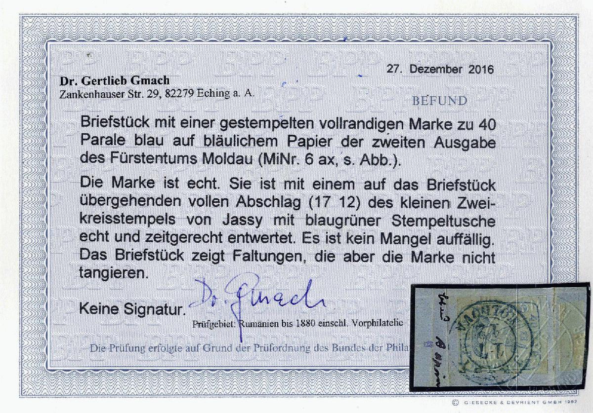 | Zusatzinformationen und Suchstichworte: | 207. Auktionshaus Schulz Auktion 18. - 21. Oktober 2024 Los 5696 Rumänien 40 Par. Freim. 1858, vollrandiges Stück auf herrlichem Bfstk. mit zentrisch klarem, blaugrünem K2 "JASSY". Ausruf 150,00 |