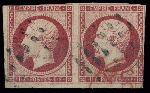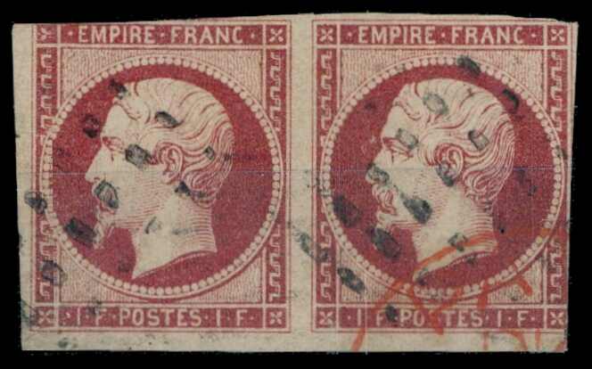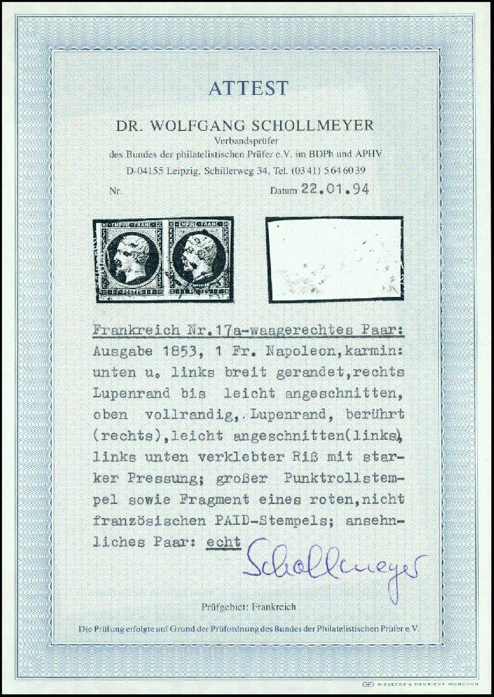 | Zusatzinformationen und Suchstichworte: | Loth 192. Auktion 6. November 2024 Los 614 Frankreich 1873, 1 Fr. karmin im waagerechten Paar, kleine Schnittmängel und links unten verklebter Riss mit starker Pressung, ausführliches Fotoattest Schollmeyer "echt, ..., ansehnliches Paar", einzeln bereits sehr seltene Marke und im Paar Liebhabereinheit Ausruf 500,00 EUR |