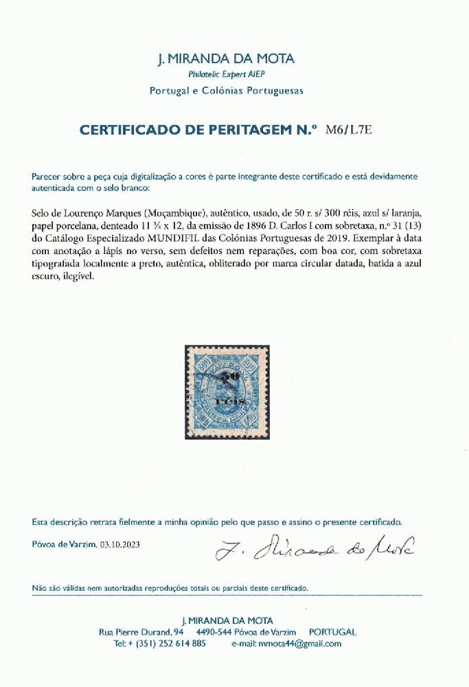 | Zusatzinformationen und Suchstichworte: | Frazao Auktion #4 25. - 26. Oktober 2024 Los 879 Lourenco Marques Lourenço Marques 1896 D. Carlos I, Mouchon, with surcharge. Stamp Mf#13, 50 s/ 300 reis, blue on orange, porcelain paper, perforation 11 3/4, with the surcharge typed locally in black. Used stamp, without gum and with hinge. Catalogue value €280. Accompanied by a certificate from Miranda da Mota. Catalogue value €280 Ausruf 60,00 EUR |