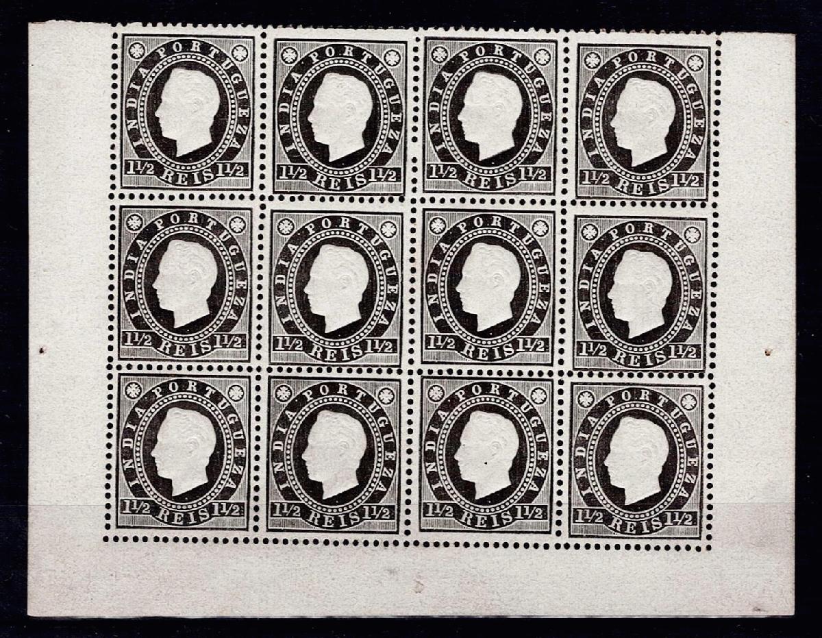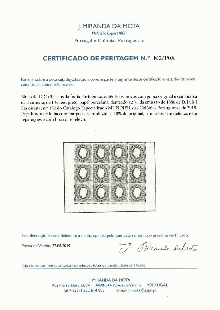| Zusatzinformationen und Suchstichworte: | Frazao Auktion #4 25. - 26. Oktober 2024 Los 703 Portugiesisch Indien India * 1886 – D. Luís I. Straight ribbon. MF132, 1 ½ réis, black, porcelain paper, 12 ¾ notch. Block of 12 stamps (4x3), lower part of sheet with margins, with original gum without hinge, without defects or repairs, with good colour and relief. Expert certificate from J. Miranda da Mota. Catalogue value € 96 Ausruf 25,00 EUR |