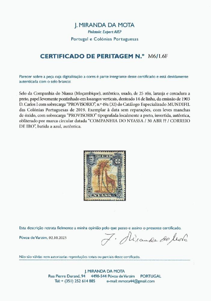 | Zusatzinformationen und Suchstichworte: | Frazao Auktion #4 25. - 26. Oktober 2024 Los 1347 Portugiesische Nyassagesellschaft Niassa Company 1903 D. Carlos I, 1901 stamps with "PROVISIONAL" overprint. Copy of Mf#49a, 25 reis, orange, paper lightly dotted in vertical diamonds, 14-line notch, with INVERTED OVERPRINT ERROR. Used stamp, with authentic postmark, without repairs, with slight oxide outcrops. Accompanied by a certificate from Miranda da Mota Ausruf 180,00 EUR |
