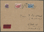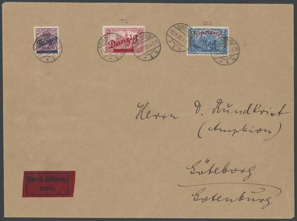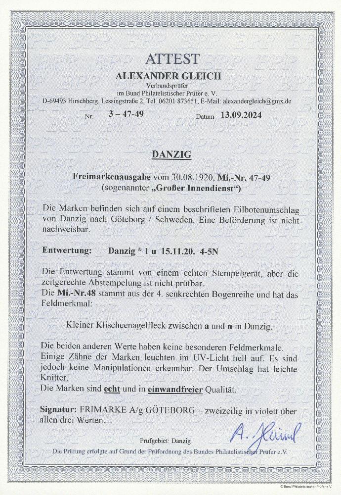 | Zusatzinformationen und Suchstichworte: | Ulrich Felzmann 182. Auktion 14. November 2024 Los 6142 Danzig Großer Innendienst komplett auf größerformatigem, nach Schweden adressiertem Kuvert, alle drei Werte einwandfrei farbfrisch, bestens gezähnt und jeweils sehr sauber, wenngleich nicht nachweislich zeitgerecht gestempelt DANZIG *1u 15.11.20, sign. FRIMARKE A/g GÖTEBORG sowie ausführliches Fotoattest Gleich BPP "... in einwandfreier Qualität" - Echt gestempelt die seltenste Spitzenausgabe Danzigs und auf Satzbrief besonders attraktiv Ausruf 2.500,00 EUR |