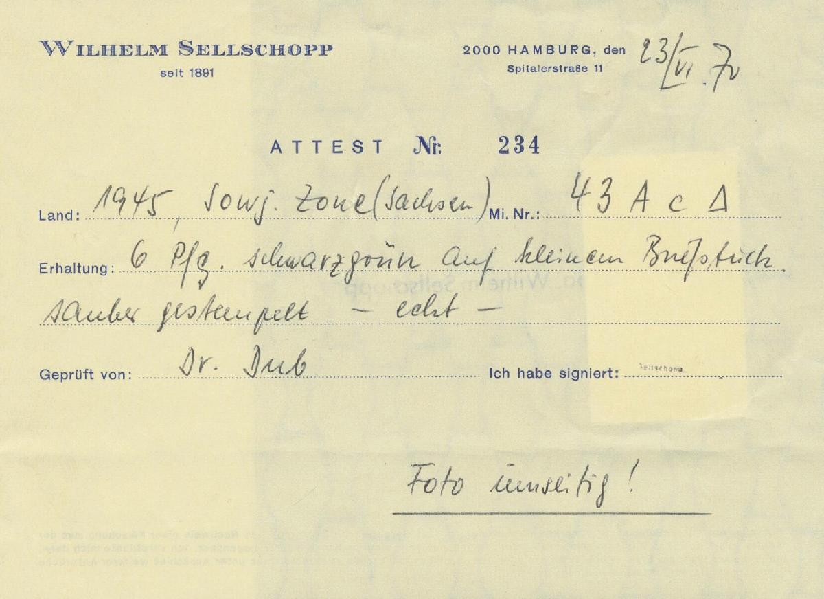 | Zusatzinformationen und Suchstichworte: | Auction Galleries Hamburg 33. Auktion 13. - 14. September 2024 Los 1682 SBZ Ostsachsen 1945, Freimarke 6 Pfg. geschnitten in der guten Farbvariante grünschwarz, vom Unterrand, gestempelt auf Briefstück, signiert Dr. Dub und Sellschopp sowie Fotoattest Sellschopp. Laut neuestem Fotoattest Dr. Jasch BPP ist die Marke echt, in gestempelter Erhaltung, weist rechts oben eine winzige Druckspur auf und weitere Einschränkungen sind nicht erkennbar. Michel 3.000,- Euro Ausruf 500,00 EUR |