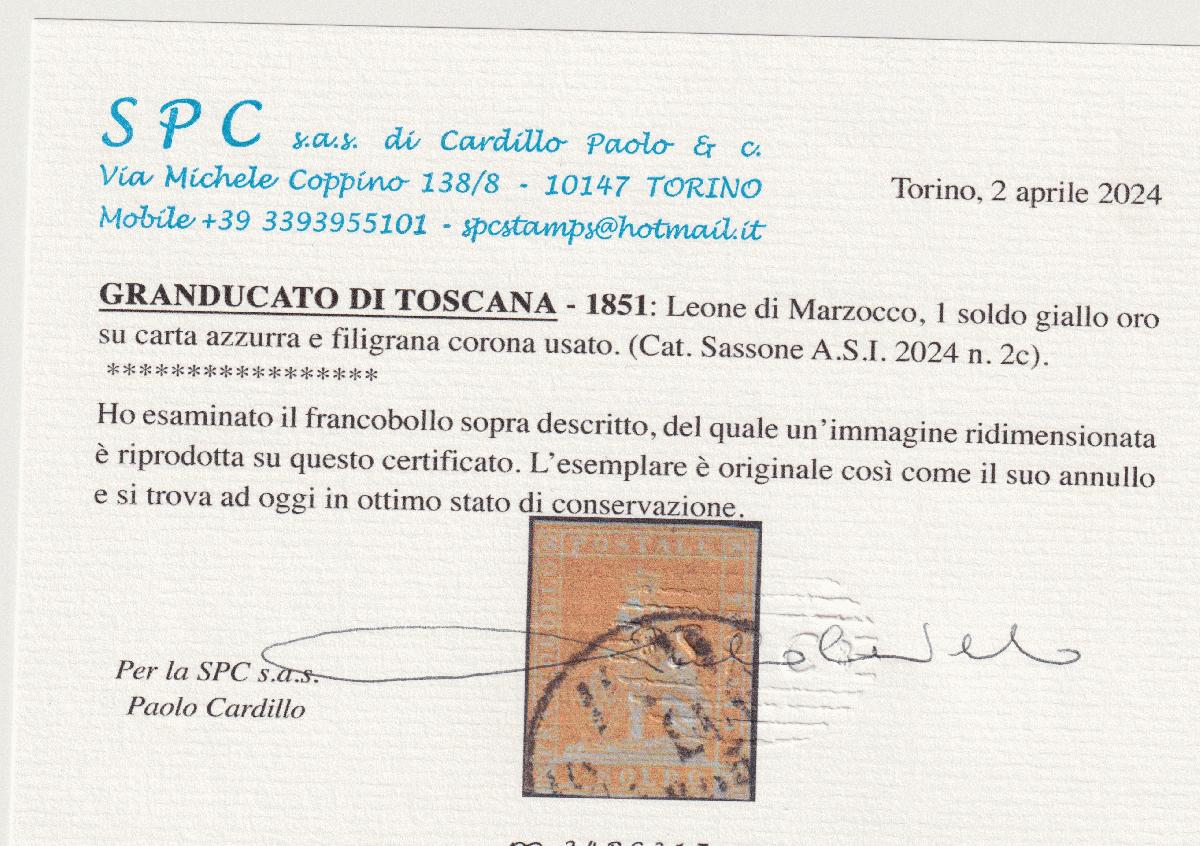 | Zusatzinformationen und Suchstichworte: | Die 1 Soldo in der seltenen Farbe goldgelb "giallo oro" der 1. Emission (Wasserzeichen Krone mit Linien). Eine Besonderheit der 1. und 2. Emission der Toskana ist es, dass bei manchen Marken ein bläuliches Papier verwendet wurde (wie bei dieser Marke), was zu einer Eintrübung der Farben führte. |