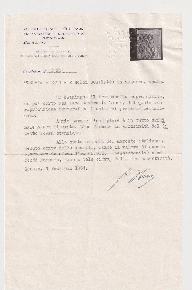 | Zusatzinformationen und Suchstichworte: | Rechts unten am Rand beschnitten, sehr seltene Marke mit dem klassischen quadratischen Karo-Muster-Stempel der Toskana "rombi", scharlachrot auf bläulichem Papier, dadurch sind manche Details auf der Marke nur schwer zu erkennen. |