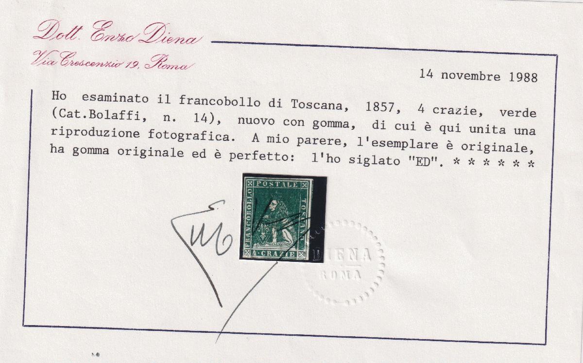 | Zusatzinformationen und Suchstichworte: | Ungebraucht mit Originalgummi. Bei dieser Marke kann man sehr gut die Echteits-Merkmale der Toskana-Editionen erkennen. |