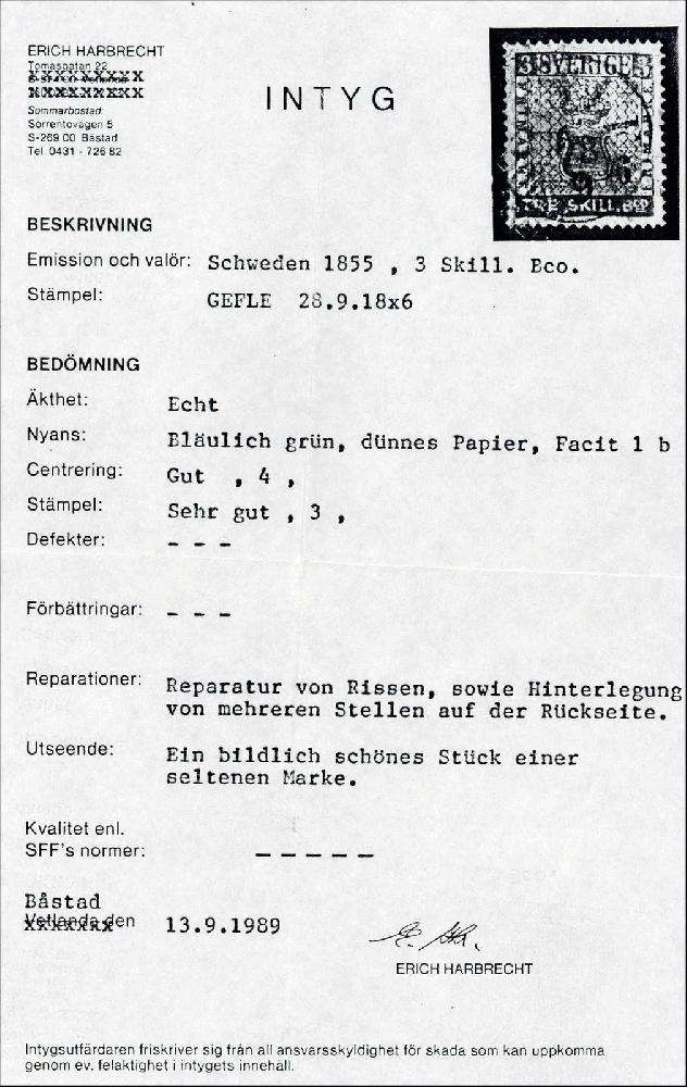 | Zusatzinformationen und Suchstichworte: | 189. Dresdner Briefmarken Auktion 22.- 24. Oktober 2024 Los 808 Schweden Skilling Banco 3 Skill. Bco. bläulichgrün, repariert, gut zentriert und sauber gestempelt GEFLE 28.9., bildseitig schönes Stück dieser seltenen Marke, Attest vom 13.9.89 Harbrecht (4.000,-) Zuschlag 490,00 EUR |