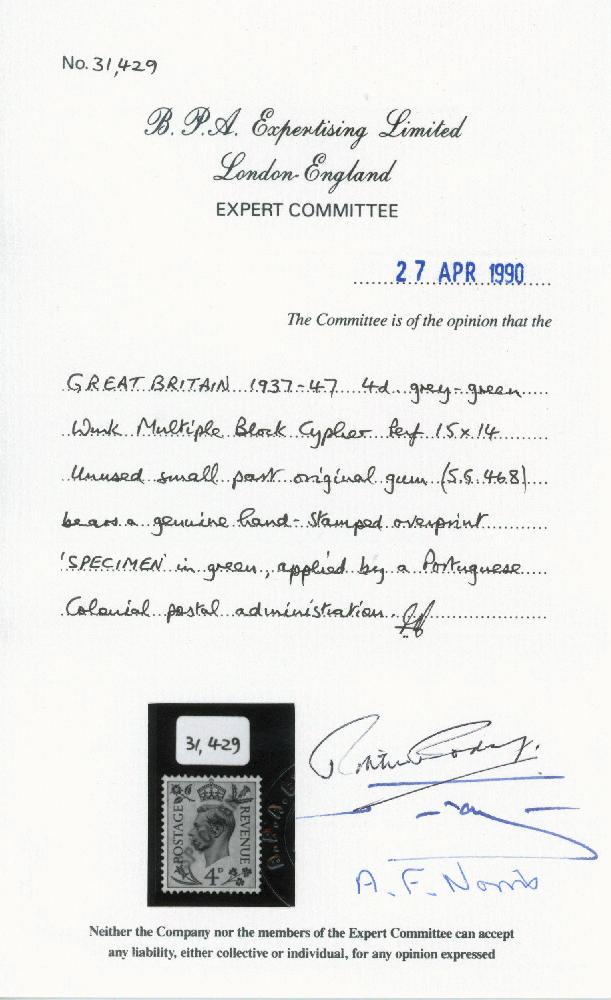 | Zusatzinformationen und Suchstichworte: | Baldwin - Stanley Gibbons - The Tony Mundy Collection of Great Britain 31. Oktober 2024 Los 20 Grossbritannien 1938 4d graugrün (SG468var). Ungebraucht kleiner Teil Originalgummi Exemplar überdruckt mit Specimen in grün, angebracht von dem portugiesisches Colonial Postverwaltung. Sehr selten. 1990 BPA Attest Ausruf 70,00 GBP |