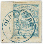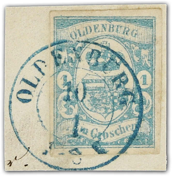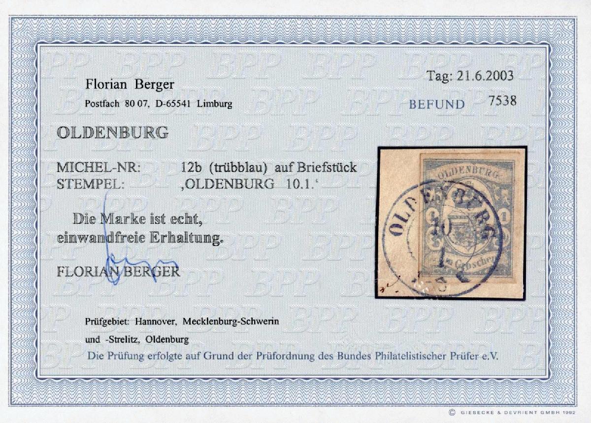 | Zusatzinformationen und Suchstichworte: | 35. Schlegel Auktionshaus Auktion 26. - 27. November 2024 Los 35 Altdeutschland Oldenburg 1861, 1 Gr. trübblau breitrandig auf Luxus-Briefstück mit Zweikreiser von "OLDENBURG". Dabei befindet sich die Marke in einem besonders intensiven, fast "milchigblauen" Farbton, der selten anzutreffen ist. Altbekanntes hervorragendes Qualitätsstück, Fotobefund Berger BPP, Fotoattest Stegmüller BPP Ausruf 300,00 EUR |