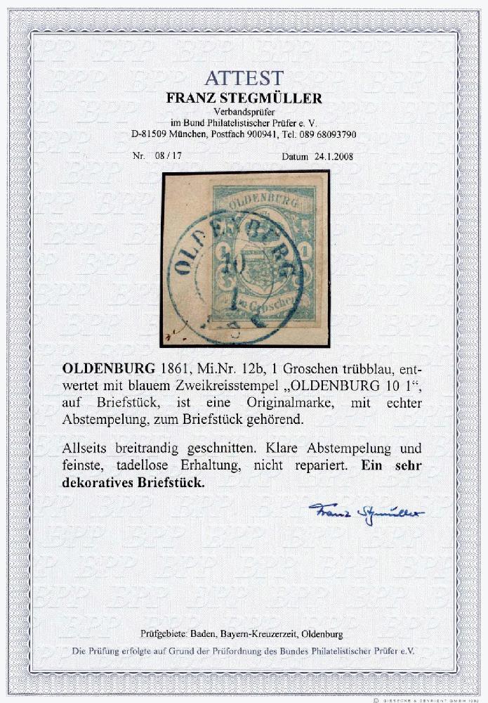 | Zusatzinformationen und Suchstichworte: | 35. Schlegel Auktionshaus Auktion 26. - 27. November 2024 Los 35 Altdeutschland Oldenburg 1861, 1 Gr. trübblau breitrandig auf Luxus-Briefstück mit Zweikreiser von "OLDENBURG". Dabei befindet sich die Marke in einem besonders intensiven, fast "milchigblauen" Farbton, der selten anzutreffen ist. Altbekanntes hervorragendes Qualitätsstück, Fotobefund Berger BPP, Fotoattest Stegmüller BPP Ausruf 300,00 EUR |