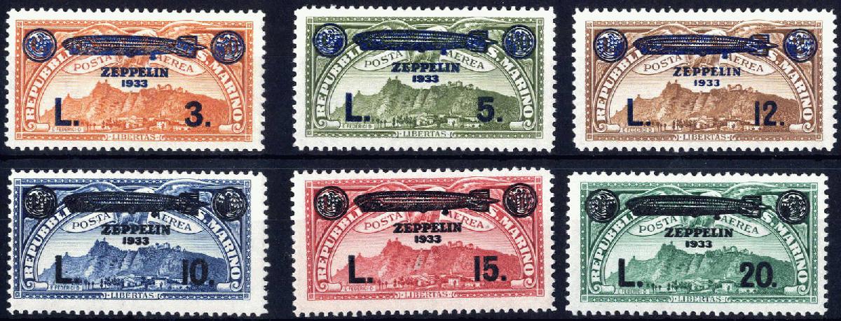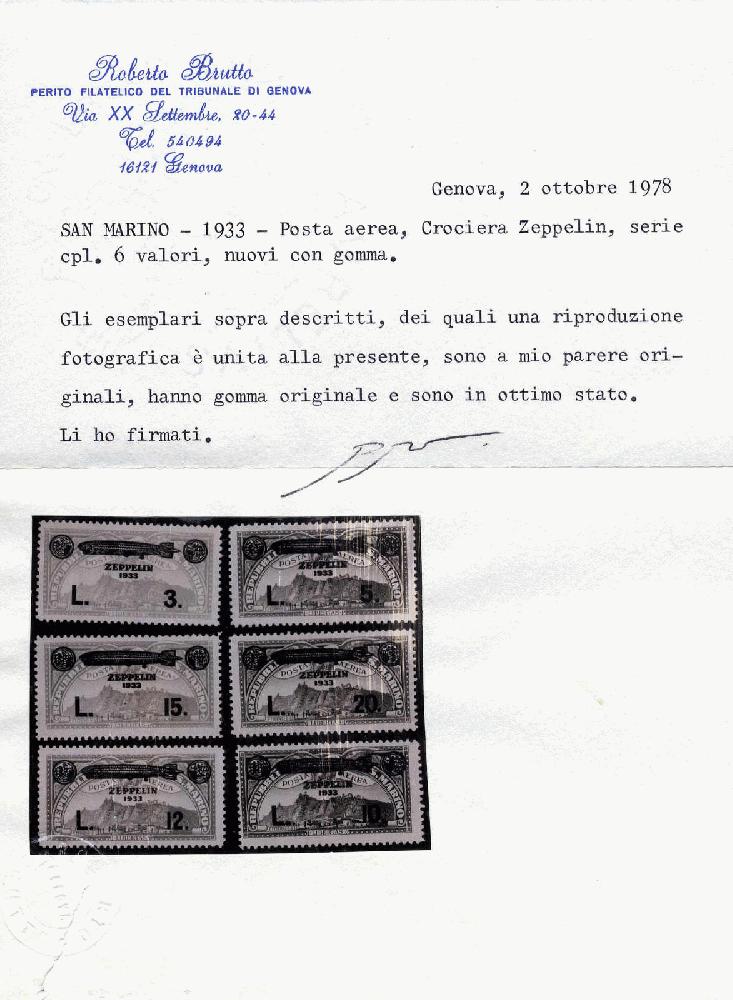| Zusatzinformationen und Suchstichworte: | Viennafil 88. Auktion - online Live 14. Mai 2024 Los 11834 San Marino 1933, Crociera Zeppelin. Posta aerea soprastampati, serie completa di 6 valori nuovi con gomma originale integra, cert. Brutto, Sass.11-16 Ausruf 120,00 EUR |