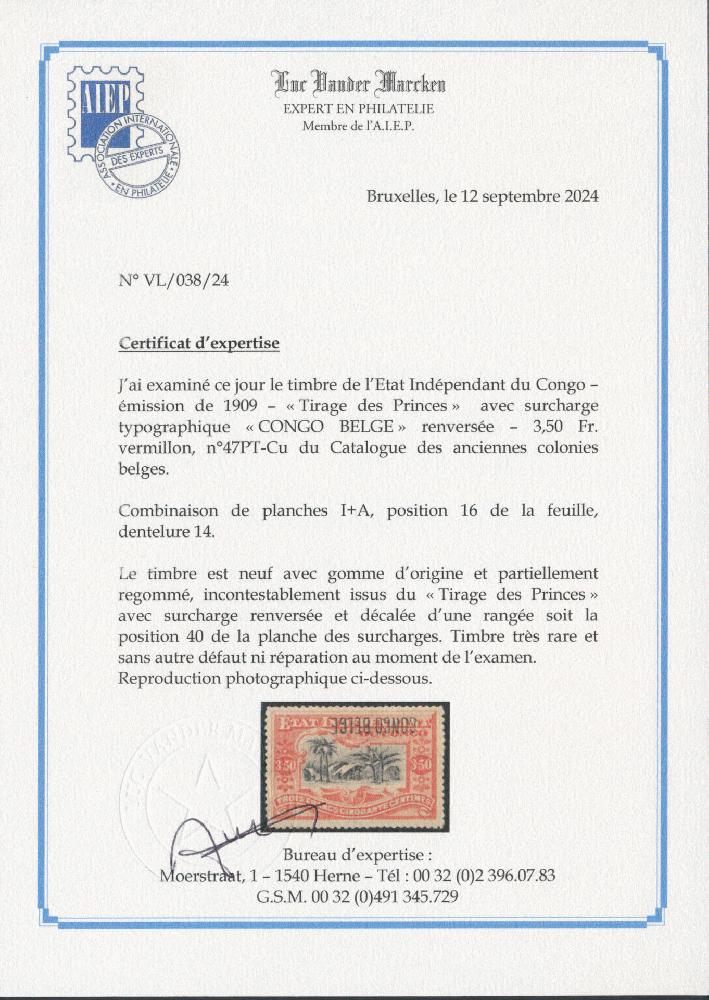 | Zusatzinformationen und Suchstichworte: | Ein ungebrauchtes Exemplar dieses Kopfstehers wurde an der 178. Van Looy Auktion vom 7. November 2024 in Antwerpen unter Los 3791 mit Attest für 200 € + Aufgeld verkauft. |