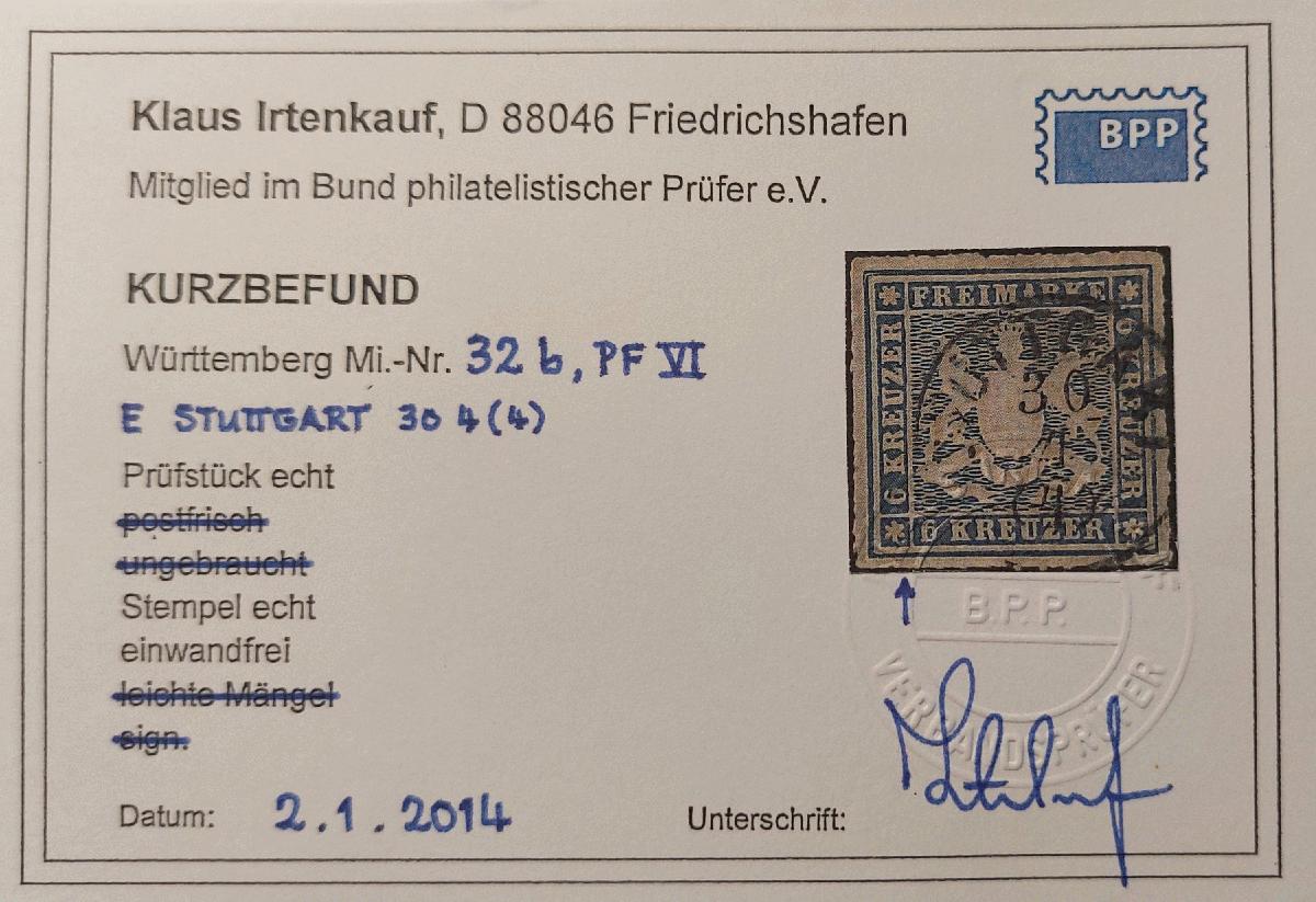 | Zusatzinformationen und Suchstichworte: | 32 b mit Plattenfehler VI, Einkreis-Stempel Stuttgart 20 4(4), Einwandfrei |