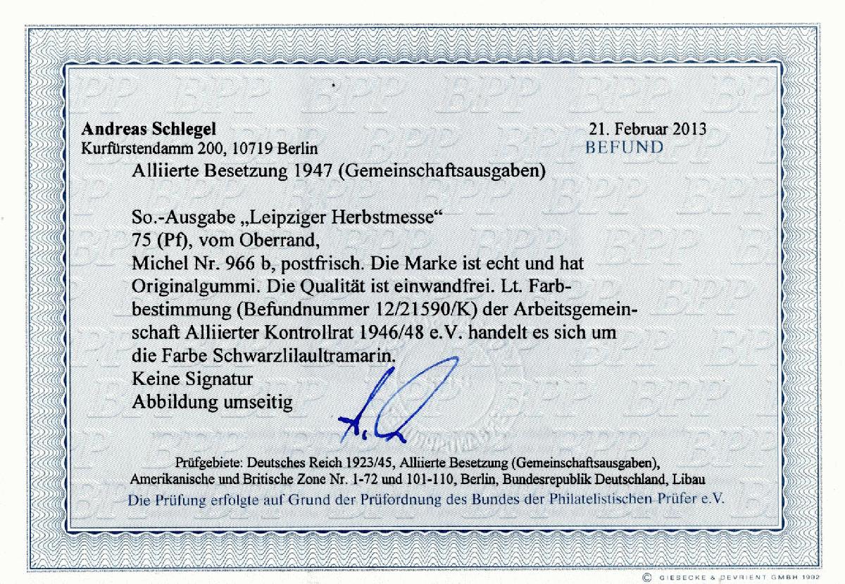 | Zusatzinformationen und Suchstichworte: | postfrische Einzelmarke mit Ostermann-Plattenfehler F03-08-13-18-23 abcd ("Punkt über der Mütze") Befund der Farbbestimmung desselben Prüfstücks siehe https://www.briefmarken-atteste.de/atteste/zeigen/26381 |