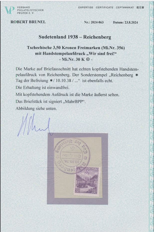 | Zusatzinformationen und Suchstichworte: | Ein gestempeltes Exemplar dieses Kopfstehers auf Abschnitt wurde an der 60. Christoph Gärtner Auktion vom 16. Oktober 2024 mit Attest unter Los 7489A für 800 € angeboten, blieb jedoch unverkauft. |
