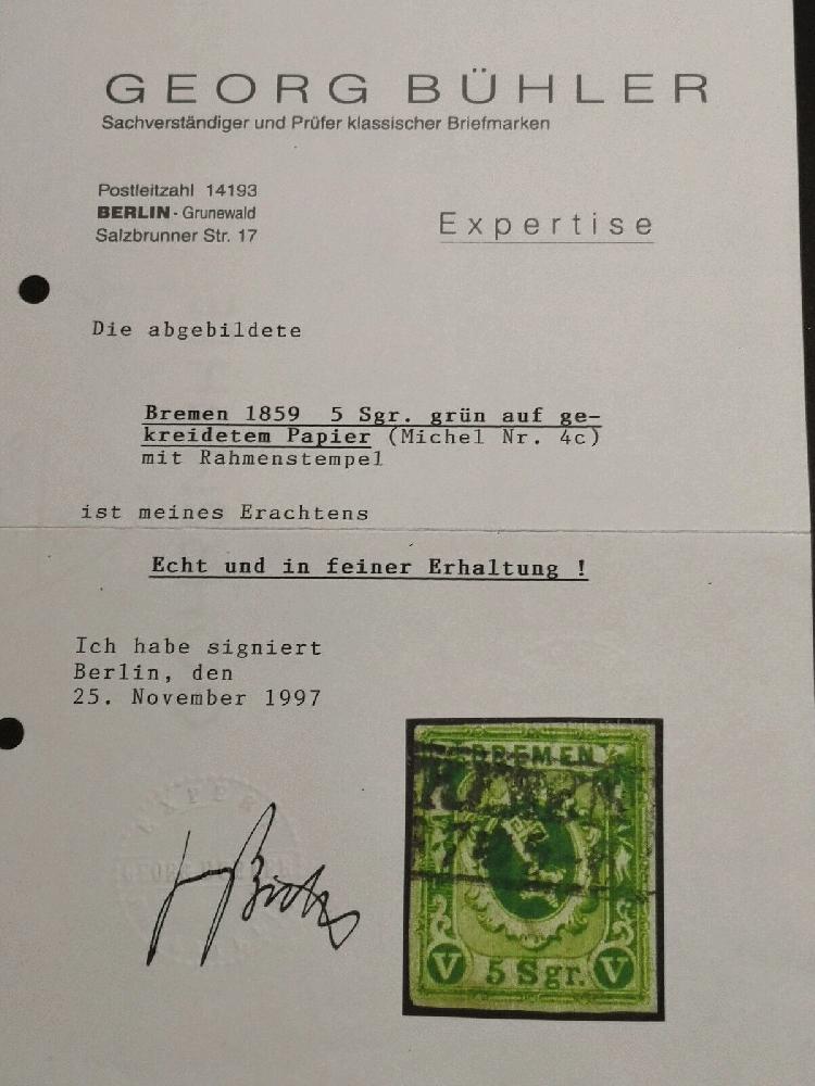 | Zusatzinformationen und Suchstichworte: | ebay.de Bremen Nr. 4 c gestempelt, geprüft, mehrfach signiert, FOTOATTEST G.BÜHLER Quelle: M. Behrends Fälschung: abgeschnittene Zähnen. |