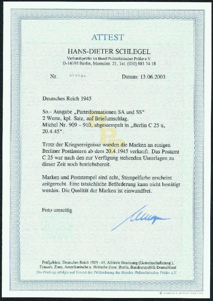 | Zusatzinformationen und Suchstichworte: | Gert Müller 125. Auktion 12. - 15. Februar 2025 SA/SS 1945 mit Zusatzfrankatur, tadellos auf Einschreibebrief von "BERLIN 20.4.45.". Diese Briefe wurden nach heutigen Erkenntnissen erst nach dem II. Weltkrieg gefertigt und eine Prüfung findet nicht mehr statt. Fotoexpertise Hans-Georg Schlegel BPP und Fotoattest Hans-Dieter Schlegel BPP Ausruf 500,00 EUR |