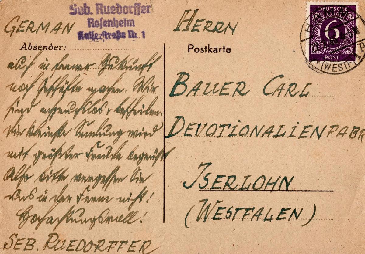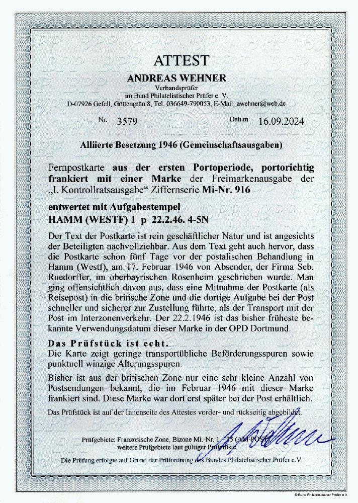| Zusatzinformationen und Suchstichworte: | Fernpostkarte Februarverwendung Artikel zu diesem Prüfstück siehe Rundbrief 61 (2 - 2024) der Arbeitsgemeinschaft Alliierter Kontrollrat 1946 – 48 e.V. |