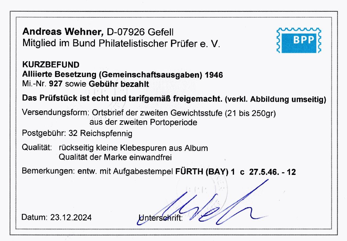 | Prüfer: | Wehner, Andreas (BPP (Bund Philatelistischer Prüfer)) |