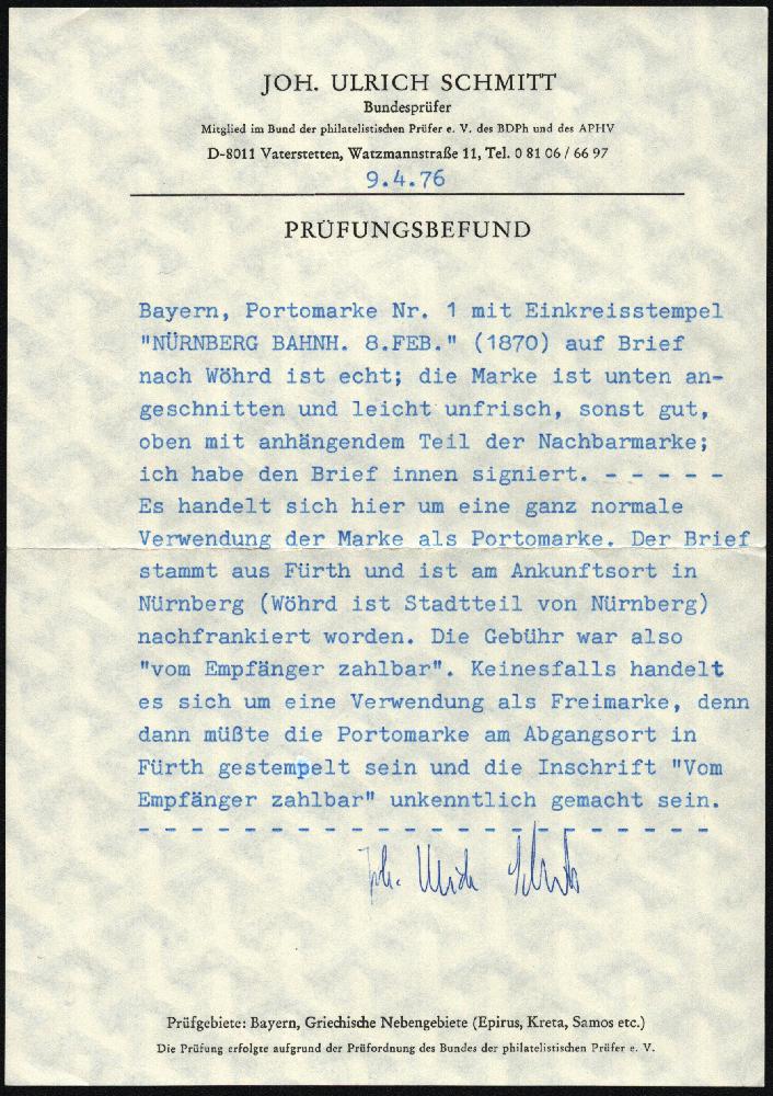 | Prüfgebiet: | Altdeutschland Bayern Portomarken |