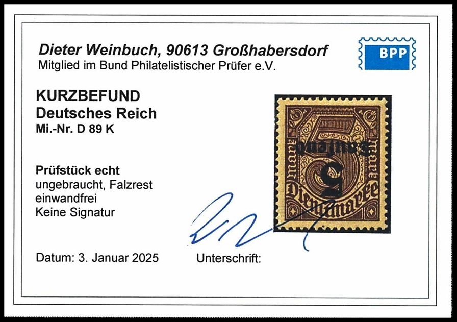 | Prüfer: | Weinbuch, Dieter (BPP (Bund Philatelistischer Prüfer)) |
