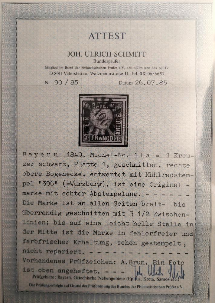 | Zusatzinformationen und Suchstichworte: | Bayern 1849, Michel-No. 1Ia = 1 Kreuzer schwarz, Platte 1, geschnitten, rechte obere Bogenecke, entwertet mit Mühlradstempel "396" (=Würzburg), ist eine Originalmarke mit echter Abstempelung. Die Marke ist an allen Seiten breit- bis überrandig geschnitten mit 3 1/2 Zwischenlinien; bis auf eine leicht helle Stelle in der Mitte ist die Marke in fehlerfreier und farbfrischer Erhaltung, schön gestempelt, nicht repariert. Vorhandenes Prüfzeichen: A.Brun. Ein Foto ist oben angeheftet. |