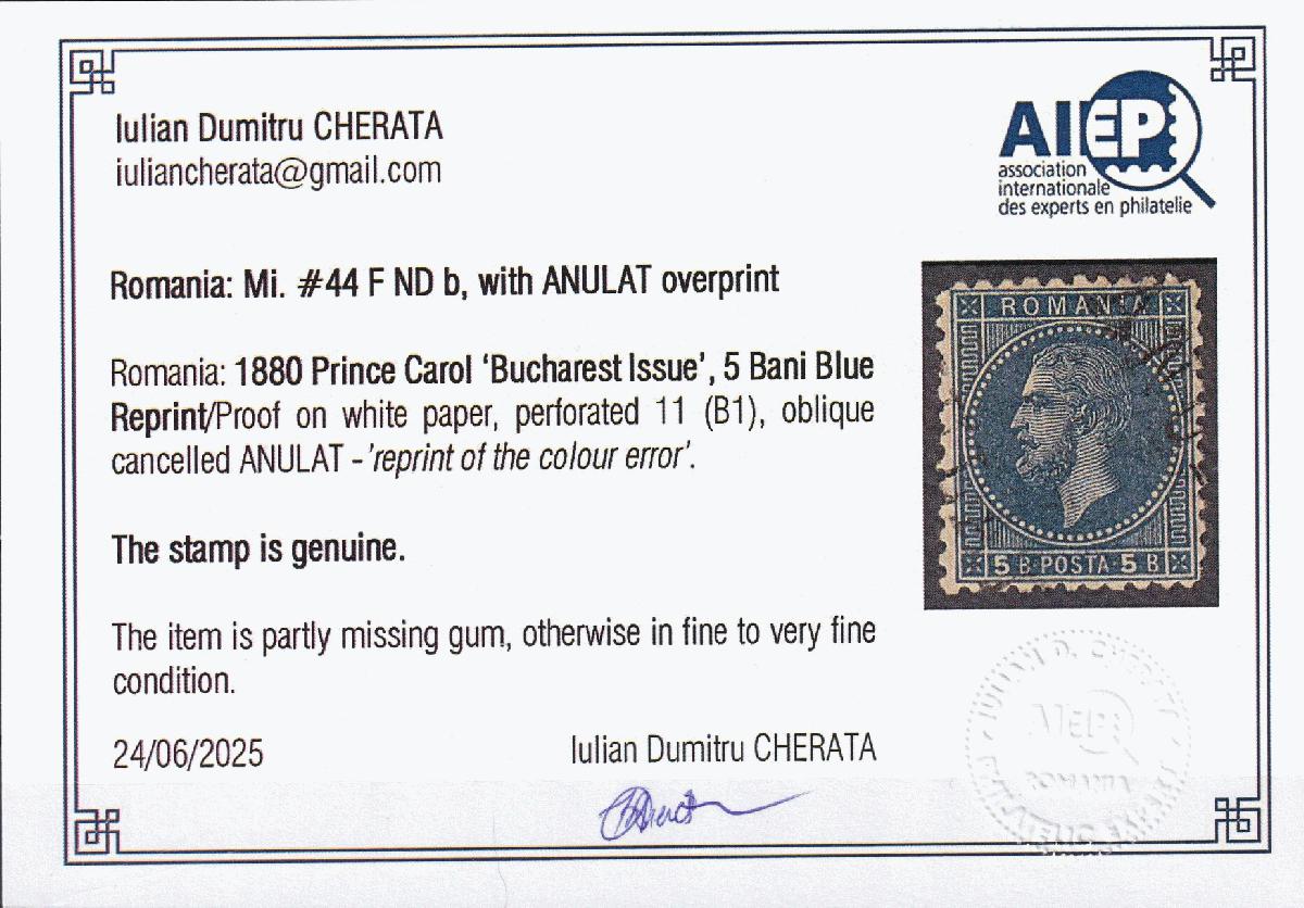 | Zusatzinformationen und Suchstichworte: | EastPhila Rumänien 1880 Prince Carol "Bukarest Issue" – 5 Bani Blue Color Error Robescu Nachdruck mit ANULAT Aufdruck (Mi. #44 F ND b) Ausruf 250,00 EUR |