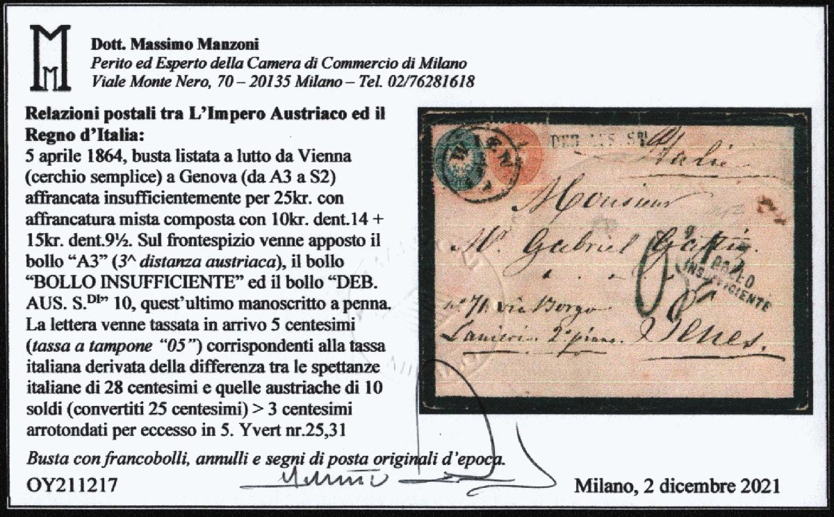 | Zusatzinformationen und Suchstichworte: | Versuch einer Übersetzung: Postbeziehungen zwischen dem Kaiserreich Österreich und dem Königreich Italien: 5. April 1864, schwarzrandiger Umschlag von Wien (Einkreis) nach Genua (von A3 nach S2), unzureichend frankiert mit 25 Kreuzer und Mischfrankatur bestehend aus 10 Kr. Zähnung 14 + 15 Kr. Zähnung 9 1/2. Das Frontispiz war mit den Vermerken „A3“ (3. österreichische Distanz), „BOLLO INSUFFICIENTE“ und „DEB. AUS. S.DI“ 10 versehen, letzteres handschriftlich. Der Brief wurde bei der Ankunft mit 5 Cent (Differenzsteuer „05“) besteuert, entsprechend der italienischen Steuer, die sich aus der Differenz zwischen dem italienischen Steuersatz von 28 Cent und dem österreichischen Steuersatz von 10 Soldi (umgerechnet 25 Cent) > 3 Cent, aufgerundet auf 5, ergab. Yvert Nr. 25,31 Umschlag mit originalen Briefmarken, Entwertungen und Poststempeln aus der Zeit. |