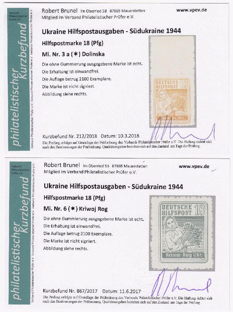 | Zusatzinformationen und Suchstichworte: | 145., 146. und 147. Teutoburger Münzauktion Auktionstermin: 28. Mai 2022 Los 4868 Deutsche Besetzung II. WK Ukraine 18 Pf. Dolinska und 18 Pf. Kriwoj Rog 1944, zwei ungebrauchte Werte wie verausgabt ohne Gummi, je mit Kurzbefund Brunel >Die Erhaltung ist einwandfrei<. Mi. 150,-€. Zuschlag 85,00 EUR |