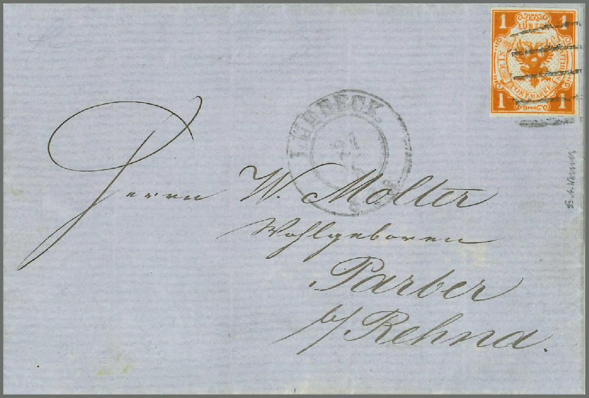 | Zusatzinformationen und Suchstichworte: | Rapp Auktion 2022 Auktionstermin: 2. - 7. Mai 2022 Los 946 Altdeutschland Lübeck 1 Sch. hellorange, in leuchtend frischen Farben, gleichmässig breite Ränder und sehr sauberem Strichstempel, daneben grosser Aufgabestempel LUEBECK 27/8 (1861) auf vollständigem Brief nach Parber bei Rehna. Laut Attest Brettl "feinste und völlig tadellose ursprüngliche Erhaltung". Zuschlag 3.000,00 CHF |