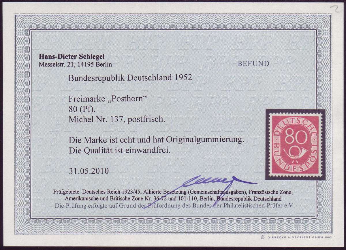| Zusatzinformationen und Suchstichworte: | Christian E. Geigle Briefmarkenfachhandel Los 0001618662 Bundesrepublik Deutschland 1951, Posthorn, 80 Pf. rosarot, postfrisches Luxusstück, hervorragend gezähnt und leuchtend farbfrisch, unsigniert mit FB Schlegel "einwandfrei". Festpreis 330,00 EUR |