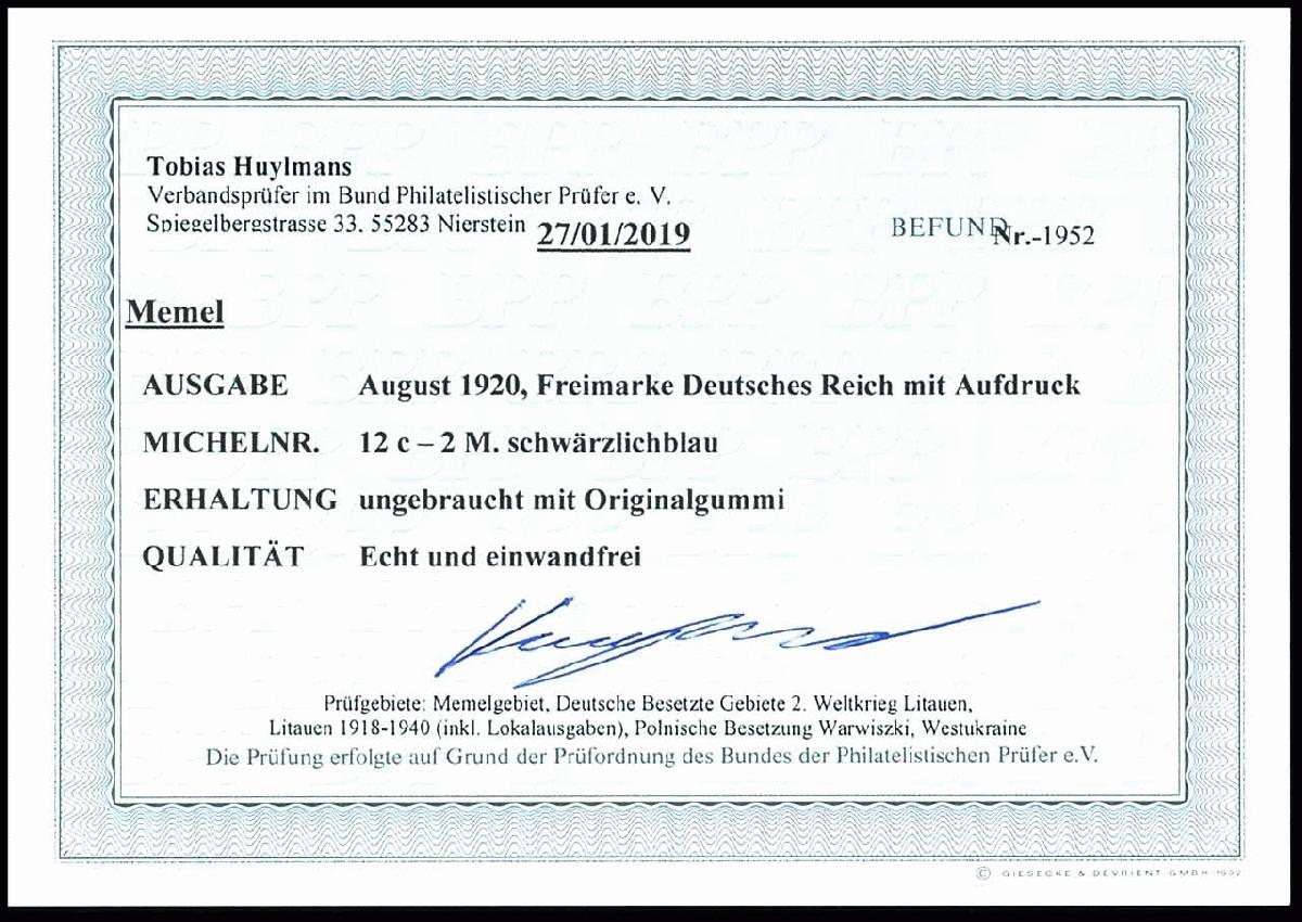 | Zusatzinformationen und Suchstichworte: | Dr. Reinhard Fischer 186. Auktion Auktionstermin: 18. - 21. Mai 2022 Los 2946 Memel 2 M. Deutsches Reich schwarzblau, tadellos ungebraucht, Fotobefund Huylmans BPP (2019) "echt und einwandfrei Zuschlag 90,00 EUR |