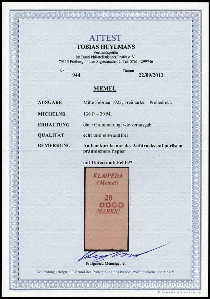 | Zusatzinformationen und Suchstichworte: | DBA Freiburg GmbH Los 1731200697 Memel 1923, 20 M. Freimarke als seltener Luxus- Probedruck nur des Aufdrucks auf porösem ungummiertem bräunlichen Papier, aktuelles Farbfotoattest Huylmans BPP vom 22.09.2013 "echt und einwandfrei" Festpreis 550,00 EUR |