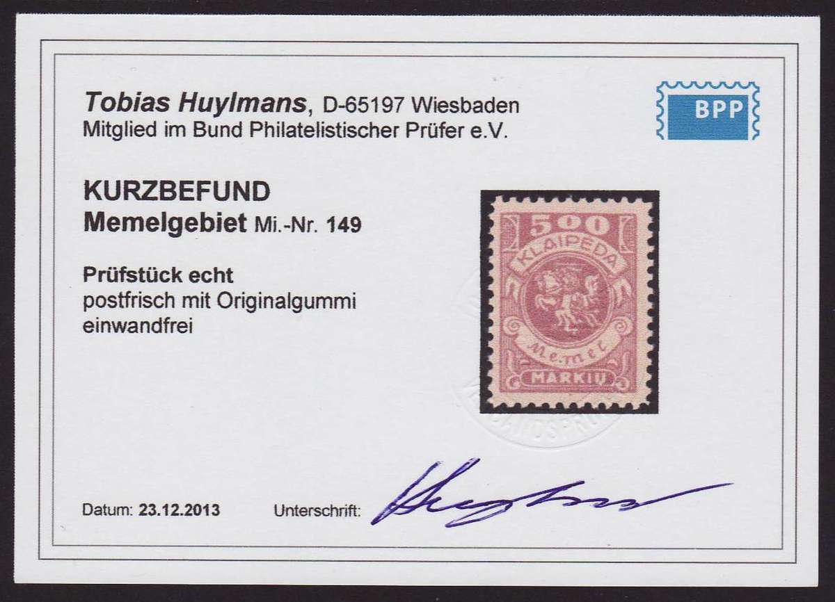 | Zusatzinformationen und Suchstichworte: | Christian E. Geigle Briefmarkenfachhandel Los 0003335303 Memel 1923, Freimarken Wappenreiter, 500 M. graulila, postfrisches Luxusstück des Höchstwertes, unsigniert mit FKB Huylmans "einwandfrei" Festpreis 55,00 EUR |