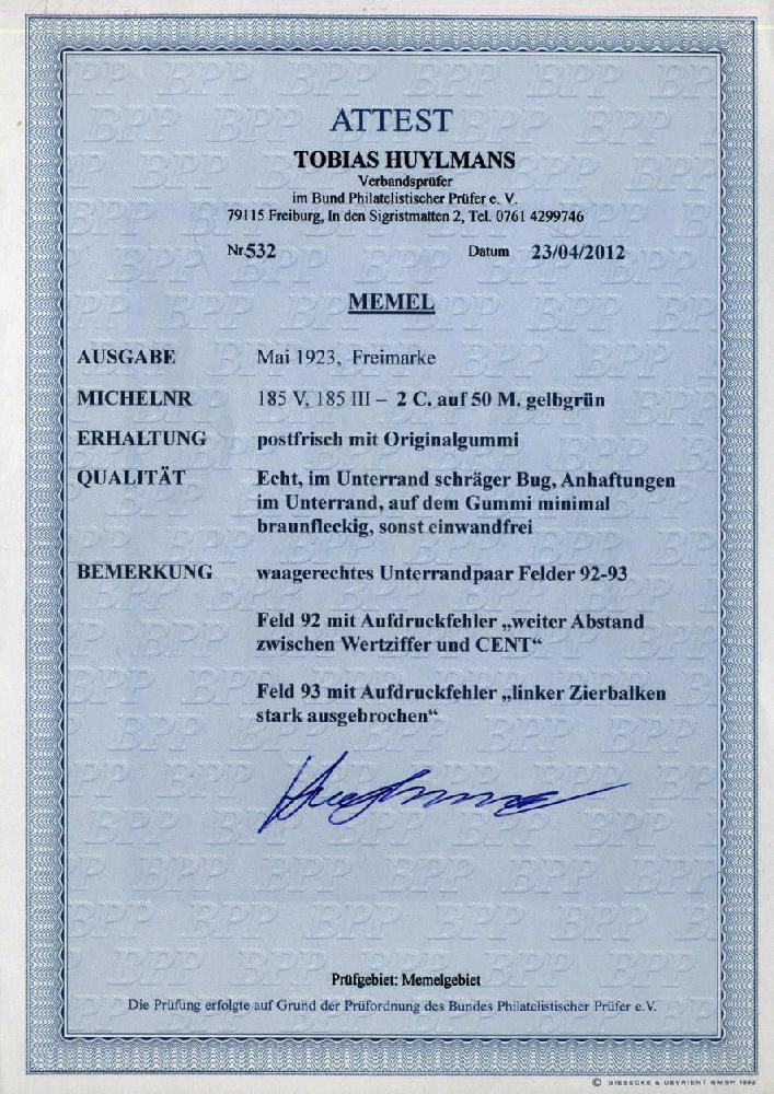 | Zusatzinformationen und Suchstichworte: | 73. AAK Phila GmbH Auktion Auktionstermin: 7. Mai 2022 Los 4593 (D) Memel 2 C a. 50 M gelbgrün im waagr. Unterrandpaar (hier schräger Bug, Anhaftungen), Marken postfr. m. FA Huylmans BPP "echt, Gummi minimal braunfleckig (sehr minimal, kaum sichtbar), sonst einwandfrei" Ausruf 125,00 EUR |