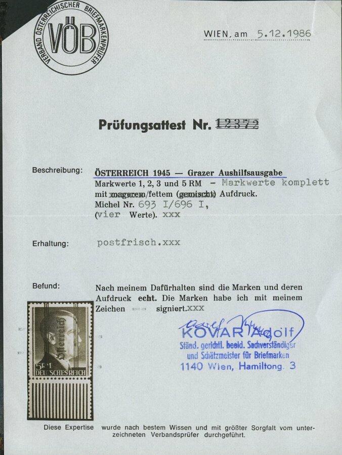 | Prüfer: | Kovar, Adolf (VÖB (Verband Österreichischer Briefmarkenprüfer)) |
