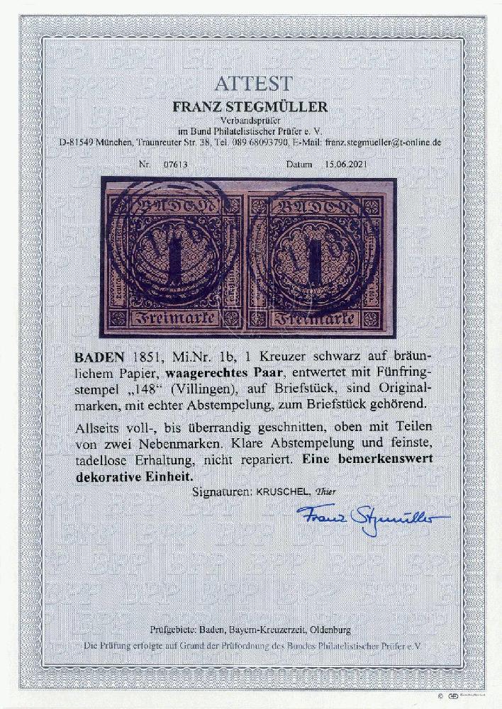 | Zusatzinformationen und Suchstichworte: | 228. Karl Pfankuch & Co Auktion Auktionstermin: 6. - 7. April 2022 Los 58 Altdeutschland Baden 1 Kr. a. bräunlich, allseits sehr schön breitrandiges waagr. Paar (oben Nebenmarken) mit Stempel "148" Villingen auf Luxus-Briefstück, sign. Thier, Kruschel, Fotoattest Stegmüller BPP. Ausruf 500,00 EUR |