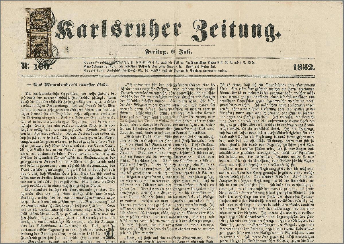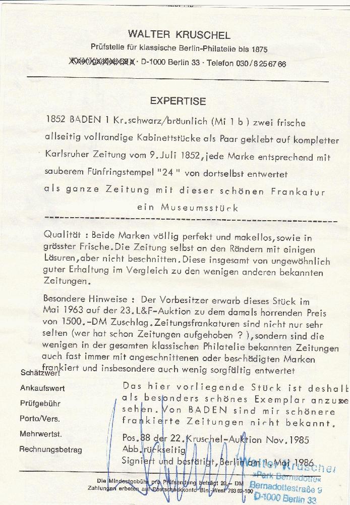| Zusatzinformationen und Suchstichworte: | Rauhut & Kruschel - 211. Auktion Auktionstermin: 21. Mai 2022 Los 199 Altdeutschland Baden 1 Kr. schw./bräunlich, zwei voll- bis breitrandige Kabinettstücke auf "Karlsruher Zeitung" (diese kleine verklebte Randmängel) aus Juli 1852, mit NS "24" von Karlsruhe. Als Frankatur auf einer Zeitung in dieser Schnittqualität selten, ex Bloch (Kruschel 1988, 10.000,- DM, von Bloch 1963 auf der 23. Lange + Fialkowski-Auktion für damals sehr beachtliche DM 1500,- + Aufg. erworben), später "Welfen"-Sammlung (Grobe 1990 Ausruf 1.300,00 EUR |