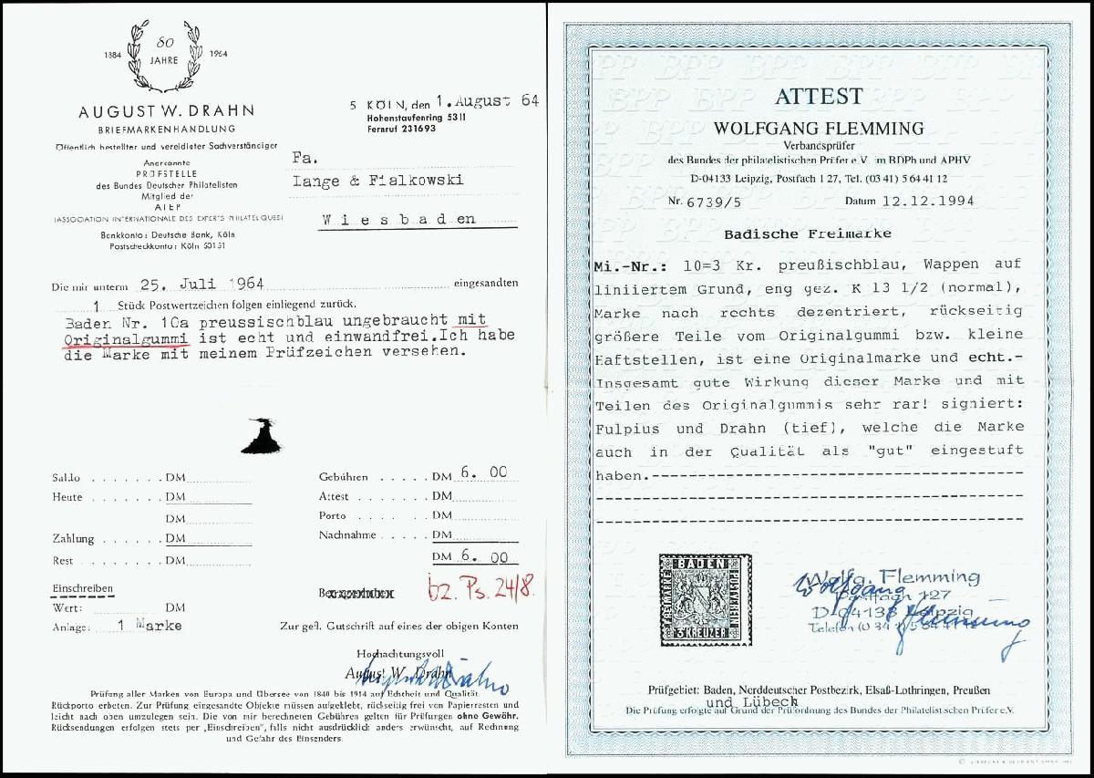 | Zusatzinformationen und Suchstichworte: | Dr. Reinhard Fischer 186. Auktion Auktionstermin: 18. - 21. Mai 2022 Los 1355 Altdeutschland Baden 3 Kr preußischblau tadellos ungebraucht mit Originalgummi und sauberem Falzrest, tiefst gepr. Drahn und Befund: "... mit Originalgummi ist echt und einwandfrei.", sowie Fulpius und Fotoattest Flemming BPP: "sehr rar!" Zuschlag 320,00 EUR |