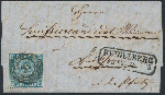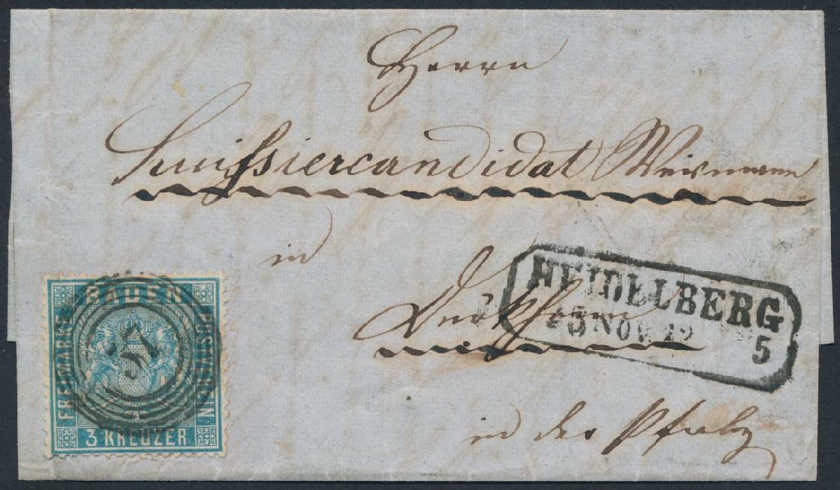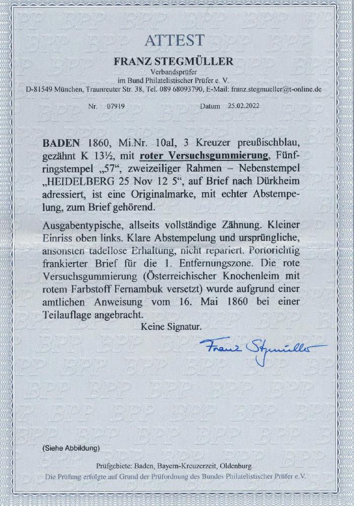 | Zusatzinformationen und Suchstichworte: | Wohlfeil 82. Auktion Auktionstermin: 17. - 18. Juni 2022 Los 401 Altdeutschland Baden 3 Kr. preußischblau, mit roter Versuchsgummierung, auf Brief mit NS "57" und beiges. Ra2 "Heidelberg", winz. Zahnspalt oben links, sonst fehlerfrei mit vollständiger Zähnung. Ausruf 200,00 EUR Zuschlag 180,00 EUR |