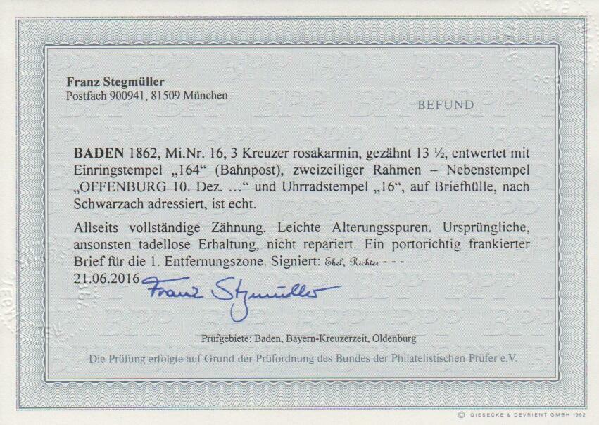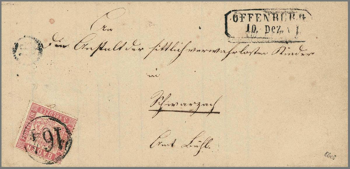 | Zusatzinformationen und Suchstichworte: | Rauhut & Kruschel - 211. Auktion Auktionstermin: 21. Mai 2022 Los 223 Altdeutschland Baden 3 Kr. rosa, Prachtbrief mit auf dieser Marke sehr seltenem Bahnpost-K1 "164" nebst Uhrrad ("16"?) und Ra2 "Offenburg", rs. u.a. Ra2 "E.B. Curs IV", sign. Ebel, Fotoexp. Stegmüller, Briefpapier unbed. Patina Ausruf 200,00 EUR |
