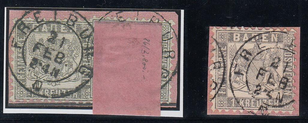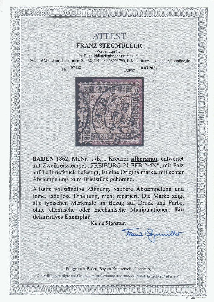 | Zusatzinformationen und Suchstichworte: | Südphila Peter Feuser 96. Auktion Auktionstermin: 7. Mai 2022 Los 138 Altdeutschland Baden 1 Kr. silbergrau, schöne typische Farbe, klar gestempeltes Kabinettstück auf dazugehörigem Rest-Briefstück, ein sehr schönes Exemplar der seltenen Marke, Attest Stegmüller Ausruf 1.500,00 EUR |
