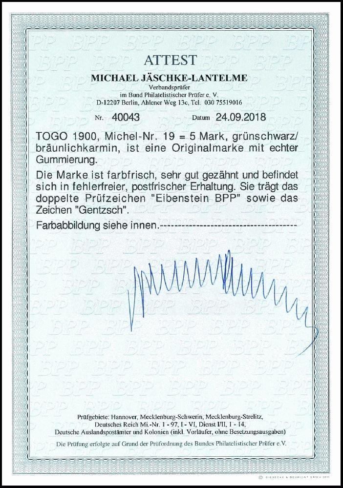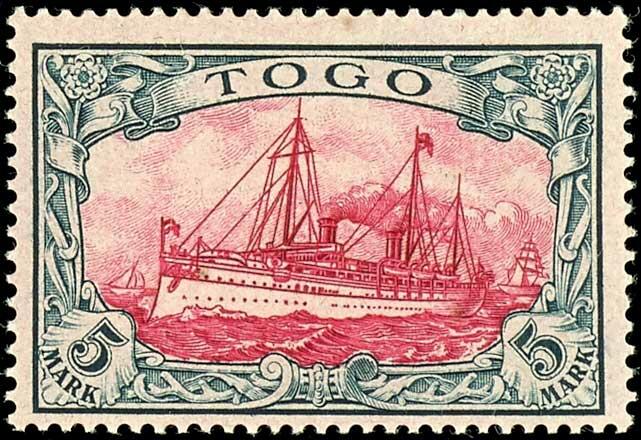 Zusatzinformationen und Suchstichworte: Dr. Reinhard Fischer 186. Auktion Auktionstermin: 18. - 21. Mai 2022 Los 2716 Deutsche Kolonien Togo 5 Mark Kaiseryacht, tadellos postfrisch, gepr. Eibenstein BPP u. a. und neues Fotoattest Jäschke-Lantelme BPP (2018): "in fehlerfreier, postfrischer Erhaltung.", Mi. 620.- unterbewertet, der 5-Mark von Togo ist ungebraucht ein ganzes Stück seltener als bei den anderen Kolonien! Ausruf 250,00 EUR