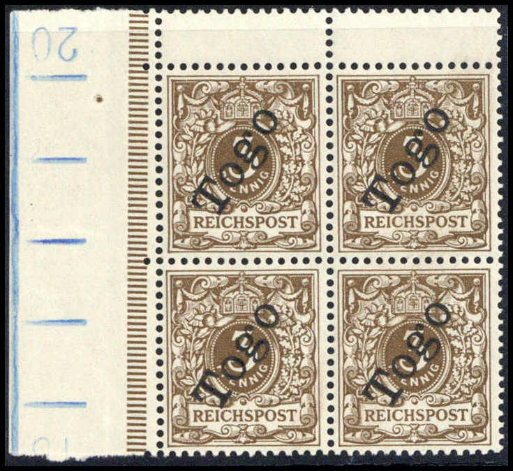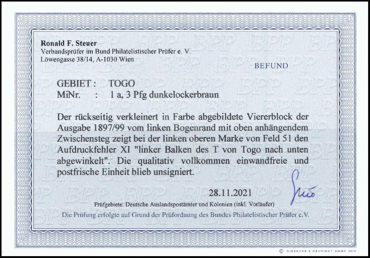 | Zusatzinformationen und Suchstichworte: | Württembergisches Auktionshaus 140. Versteigerung Auktionstermin: 18. Juni 2022 Los 7754 Deutsche Kolonien Togo 3 Pfg., Aufdruckfehler XI, tadellos in postfrischem Viererblock, oben mit Zwischensteg, li. mit kpl. Bogenrand und blauem cm-Maß, Fotobefund Steuer BPP. Ausruf 100,00 EU |