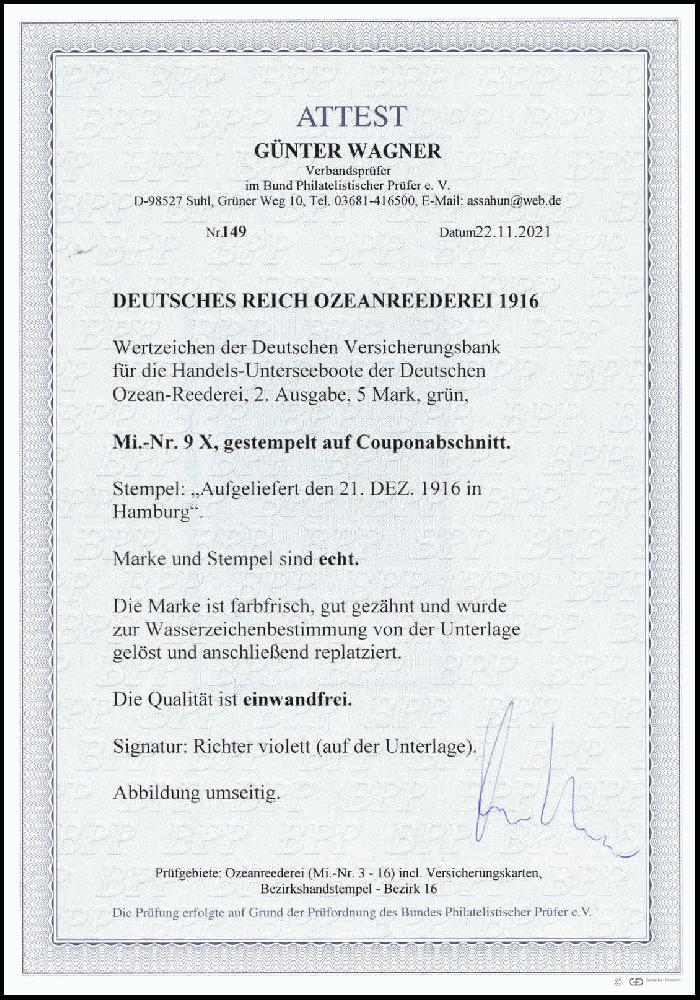 | Prüfgebiet: | Deutsches Reich Schiffspost im Ausland Ozeanreederei 1916/17 |