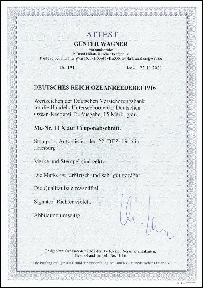 | Prüfgebiet: | Deutsches Reich Schiffspost im Ausland Ozeanreederei 1916/17 |