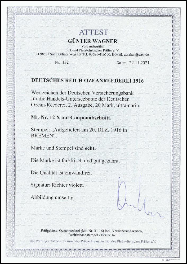| Prüfgebiet: | Deutsches Reich Schiffspost im Ausland Ozeanreederei 1916/17 |